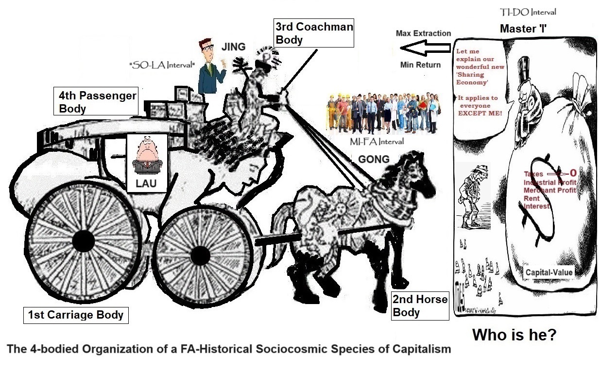 2   Inside the FA-Historical Sociocosmic Species of Capitalism, there are 7 concentric levels of the sociocosmic octave specific, four of which have a four-bodied laujinggong carriage configuration, namely: the FA-Laujinggong Carriage, the SO-Laujinggong Carriage, the LA-Laujinggong Carriage and the TI-Laujinggong Carriage.  The FA-Laujinggong Carriages houses all the 7 possible Corporate Production-Distribution-Consumption-Exchange (PDCE) Systems and the three higher levels of concentric SO-, LA- and TI-Laujinggong Carriages house the mainstream fundamental Regulatorate Systems.  As to the three lower levels of concentric DO-, RE- and MI-diadic carriages of this sociocosmic octave specific, there are no laujinggong carriages but with a three-brained hethormen human being of a socially stopinderable DO-Individual, a worm-like diadic leader-follower body of the RE-Group and semi-diadic/triadic Parents-Children household body of the MI-Family.  Between the MI-Family and the FA-Organization, there is a MI-FA Interval filled with laujinggong carriages of the PDCE corporates; above this interval are the continuity of the mainstream fundamental regulatory laujinggong carriages, and at the "SO-LA Interval" it is linkpin-welded/filled with the possible 7 laujinggong carriages of the nationates right up into the TI-DO Interval and beyond, and at the TI-DO Interval an infantile Sociocosmic Will of the antagonistic infantile essences of bickering evolutionary dongjinggong carriages and battling revolutionary gongjinglau and gongjingdong carriages in ascend-descend oscillation due to the power of an emerging SO-Historical Sociocosmic Species of Socialism. The outcome is a mystifying sociocosmic phenomenon typical of an aberrating polar FA-SO-LA-TI Historical Periods of Capitalism and Socialism - of two antagonistic individualistic and collectivistic forces on the NOO-Superstructure-Base Carriage of a historical sociocosmic species which in turn is housed in one or more of the collective four-bodied NOO-PESTLES(+)-PDCE Carriages of civilization of the One Earth Civilization.